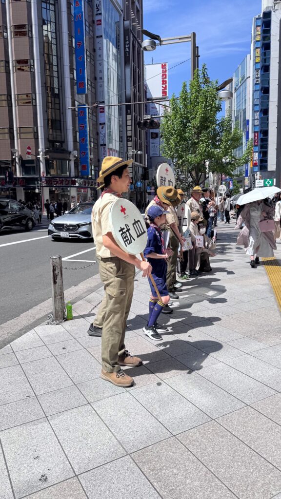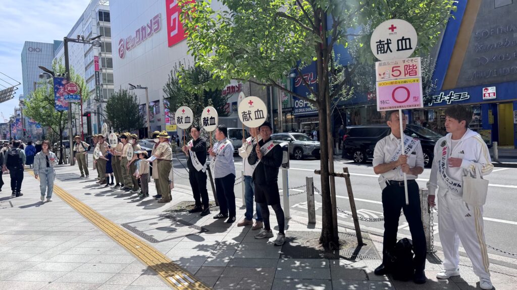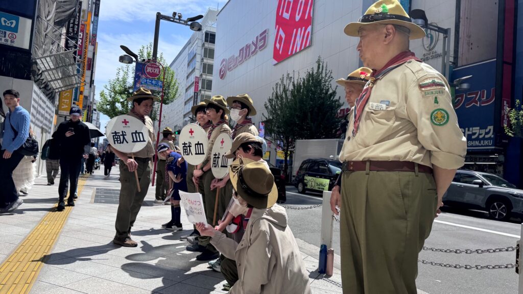 東京豊新ライオンズクラブは、新宿第4団ボースカウトのみなさん(12名)と春の温かい日差しが降り注ぐなか献血呼びかけのアクティビティを行いました。新宿通りのT&TⅢビル前で「本日O型とくに不足しています!献血にご協力ください、献血ルームはこのビル5階です」と元気いっぱい呼びかけた。約1時間の呼びかけで20名の受付がありました。(LCメンバー12名)